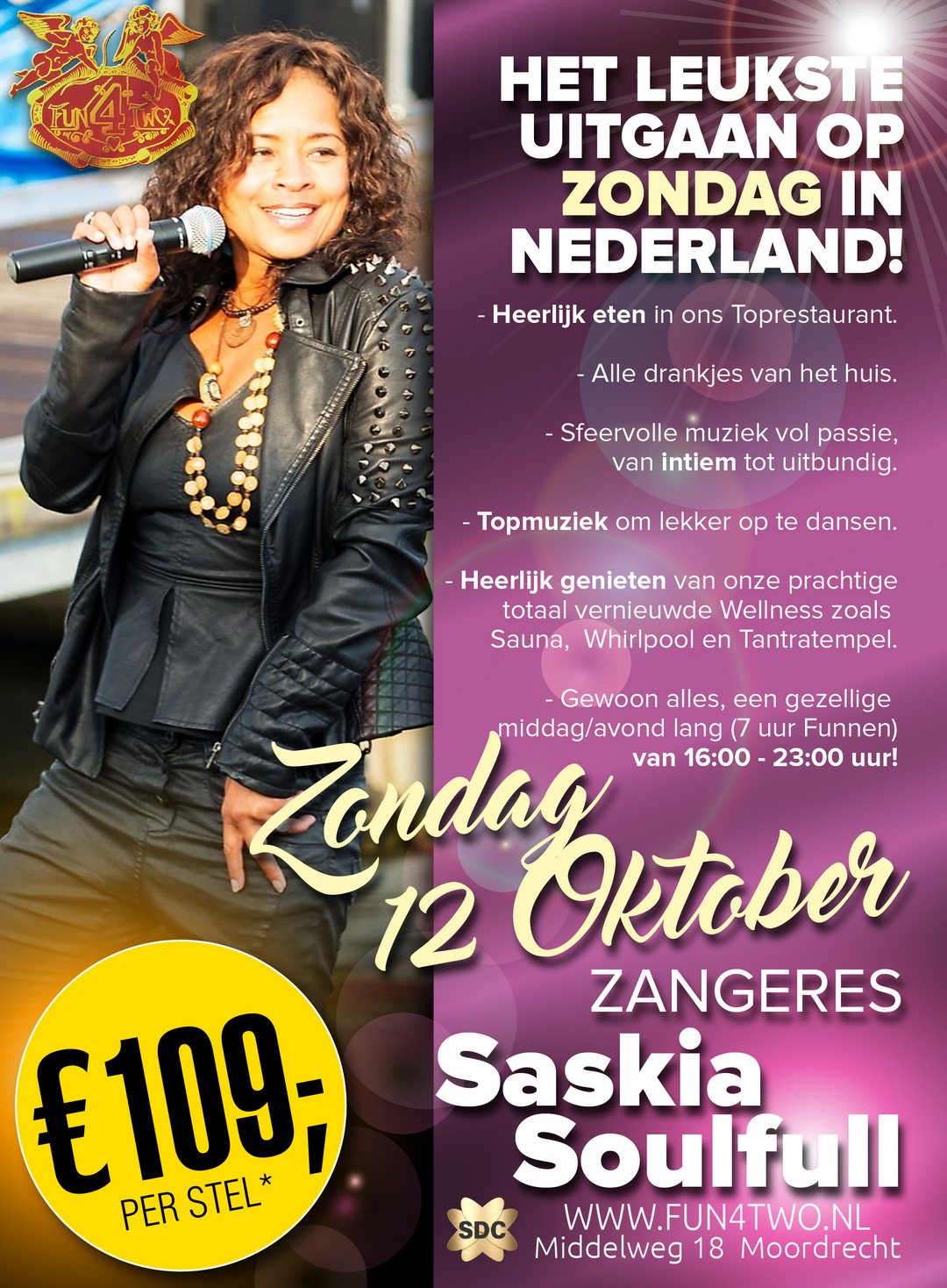 Deze zondag, maak haar dag goed... Verras je geliefde en bezorg haar een fantastische avond uit voor maar € 109,- per stel... All-Inclusive! Het is vandaag allemaal bij de prijs inbegrepen (zelfs wanneer jullie gratis naar binnen bent binnengekomen, bij inlevering van je strippenkaart). Ook deze zondag hebben wij weer een kanjer van een artiest voor jullie geboekt! En ook dit optreden zit bij de prijs inbegrepen. Jullie zien, zoals altijd, krijg je héél véél waarde voor je geld in Fun4Two.